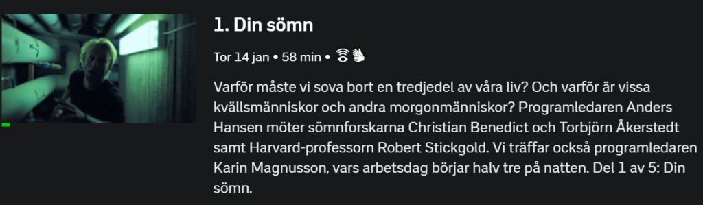 Länk: https://www.svtplay.se/video/29740470/din-hjarna/din-hjarna-sasong-2-din-somn?start=auto