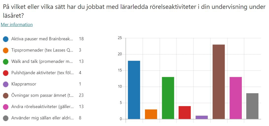 En skolsatsning på rörelsepauser med syfte att minska stillasittandet kräver engagemang från skolledare, lärare och elever. Man behöver se och förstå nyttan med att få in ny energi in i systemet. Men även om man ställer sig positiv till detta så måste arbetssättet och metoden för den som leder dessa rörelsepauser anpassas beroende på klass, plats, lektionstid, gruppdynamik, lektionsinnehåll och egna tidigare erfarenheter. En övningsbank med enkla och korta instruktionsfilmer (brainbreaks) har visat sig vara effektivt för många och blir dessutom visuellt tydligt att följa. Ett annat bra sätt har varit korta pulshöjare såsom just dance som kunnat projiceras mot filmduk eller whiteboard. Även kortare promenader där man samtidigt diskuterar någon ämnesspecifik fråga (walk n talk och tipspromenader med qr-koder) är gångbara i många lägen. Flera kollegor som planerar för korta rörelsepauser hittar moment där eleverna förflyttar sig i klassrummet i olika arbetsgrupper under lektionerna. På så sätt blir det en naturlig rörelse, även om det inte är så pulshöjande. En enkät som gick ut till lärarna efter läsårets slut, visade att metoderna är många och att man behöver anpassa och vara lyhörd för elevernas behov av pauser. Vi behöver dock få med alla på tåget och lite är bättre än inget!