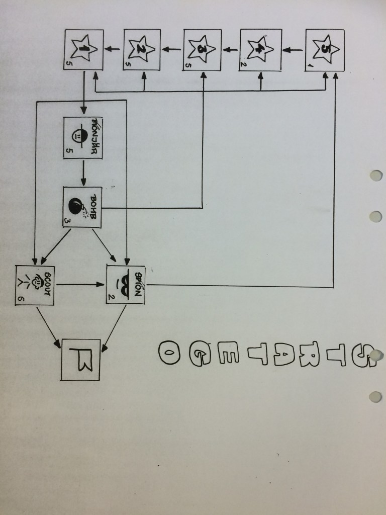 Gruppen delas upp i två grupper (röda och blå) och varje lag får kort med samma sin färg. Alla deltagarna plockar ett valfritt kort (bomb, spion, scout, pionjär mm från högen). Någon i laget måste ha kortet med flaggan och alla behöver veta om i laget vem som har detta kort. Nu gäller det att springa ut på planen (en begränsad yta) och springa fram till motståndarna och kulla dessa. När man blir kullad visar man korten för varandra och den som då vinner (bäst kort) får ta med sig motståndarens kort till sin korthög. Den som förlorar får springa ner till sin korthög igen (startplatsen) och hämta ett nytt kort. Man ju då välja att ta ett bättre kort än den motståndaren som kullade dig från början och ta hen igen eller också försöka ta någon annan. Under spelets gång får alla korten använda oavsett färg men man får inte byta kort förrän man blir av med sitt eget. Spelet går ut på att ta flaggan genom att komma på vem som har detta kort i laget och kulla denna med rätt kort (bara spion eller scout). För att veta vilket kort som tar vem så följer man pilarna på kortets baksida (spelplanen). Ex: Bomben kan ta alla utom pionjär och Flaggan då dessa har pilar som går mot bomben. Om flaggan blir påkommen så gäller det för laget att skydda sin flagga med olika kort och det är viktigt att varje kamp (de som kullar varandra) bara består av 2 personer och när man tagit kortet så måste man springa hem och lämna innan man fortsätter. Se bifogade bilder och spelplan.