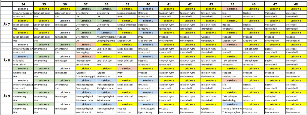 För att synliggöra innehållet och fördelningen av teman/block så har det för oss fungerat bra att färgkoda alla lektioner. Att planera är en sak och att följa hela sin planering är en annan, men finns skalet så är det ofta lättare att baklängesplanera utifrån tid och förutsättningar. Eftersom LGR 22 inneburit att flera kunskapskrav/betygskriterier slagit ihop för ämnet idrott och hälsa så är färgerna också färre än tidigare årsplaneringar. Utvärdering efter året får visa om det uppfattats som tydligt och om vi lagt fokus på rätt saker i rätt årskurs och termin.