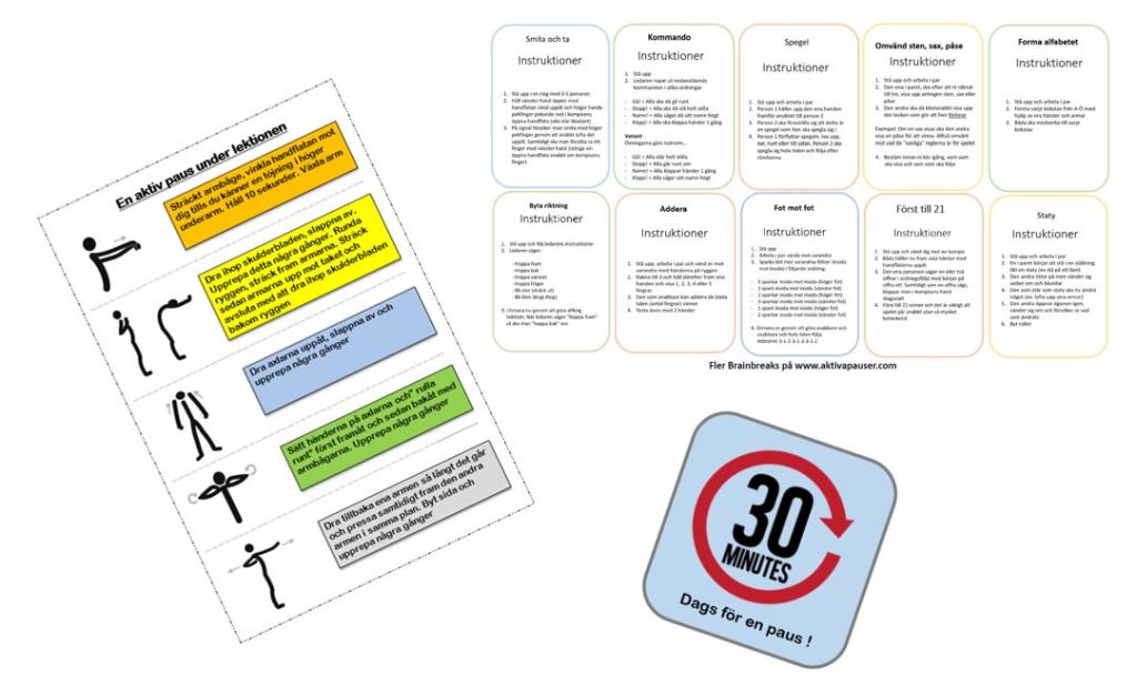 Att ta pauser med jämna mellanrum är ofta något som tyvärr glöms bort och vi behöver hjälpas åt för att minska stillasittandet. Dessutom kan vi behöva tips på övningar och brainbreaks som aktiverar både kropp och sinne så att vi kan behålla fokus. Dessa lappar kan laddas ner, plastas in och tejpas på whiteboard, dörrar eller på bänkar så att arbetet med rörelsepauser underlättas. Lycka till!