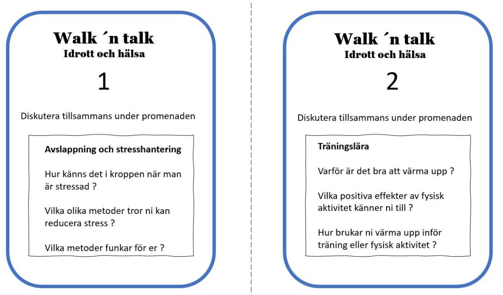 För lärare i idrott och hälsa finns här 12 olika kort som ni gärna får ladda ner. Kan vara bra att använda till elever som t.ex. tar en promenad och som inte kan delta i orinarie undervisning av någon anledning.